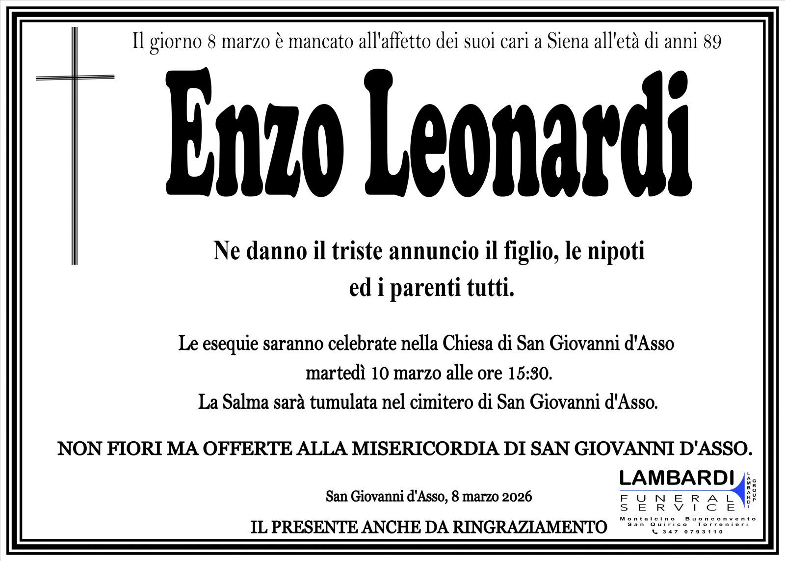 Lascia gratuitamente un messaggio di cordoglio, sarà nostra cura consegnarlo ai congiunti di ENZO LEONARDI.