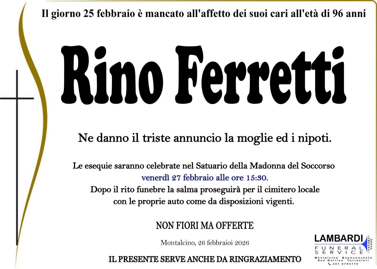 Lascia gratuitamente un messaggio di cordoglio, sarà nostra cura consegnarlo ai congiunti di RINO FERRETTI.